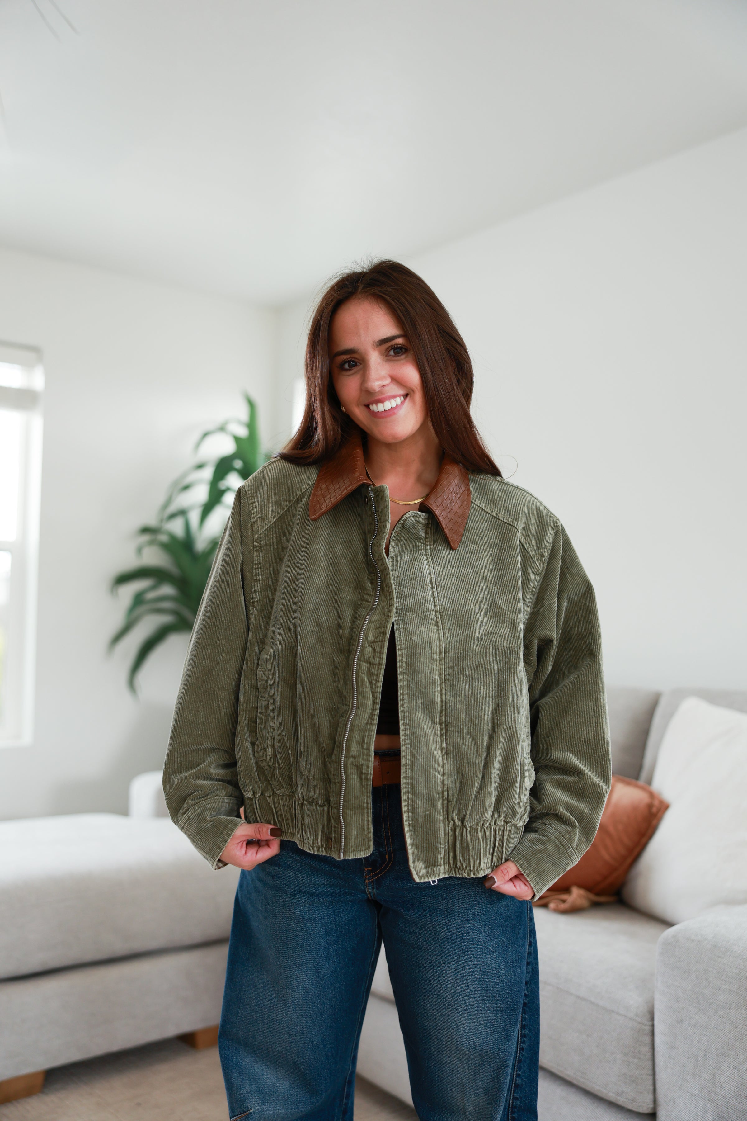 Women's mineral washed corduroy button down jacket. Designed with a fuax leather collar.
